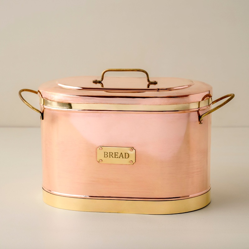 Keep your bread fresh and your kitchen stylish with the Copper Bread Box. Its rounded copper design with brass details adds a vintage charm to any countertop while protecting your baked goods. Durable and attractive, its a practical addition to your kitche
