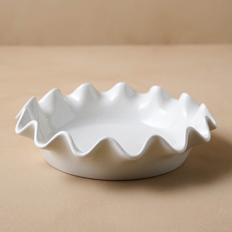 Elevate your favorite pie recipe with our Cream Speckled Baking Dish. Designed in-house, this heirloom-worthy ceramic dish features prominent scalloped detailing balanced with a soft cream color.