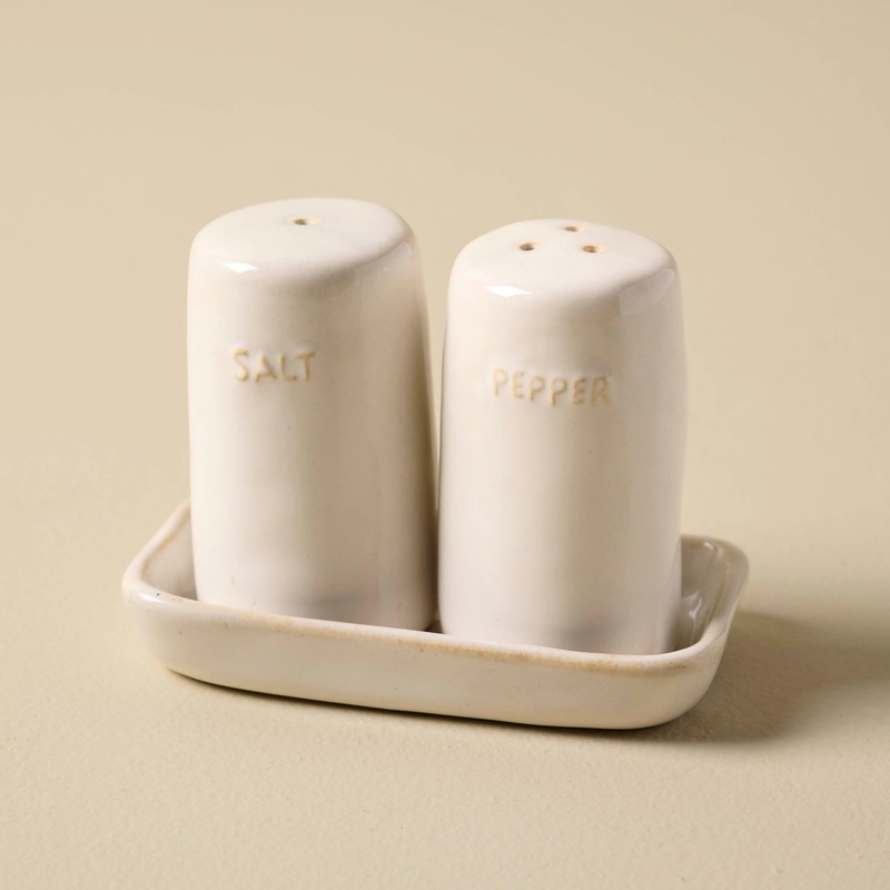 Bring the handmade look to your table with our Established Salt and Pepper Shakers. These simple ceramic shakers feature a grey-ivory glaze and embossed labels reading Salt and Pepper.As part of our exclusive collection, the included plate features an embo