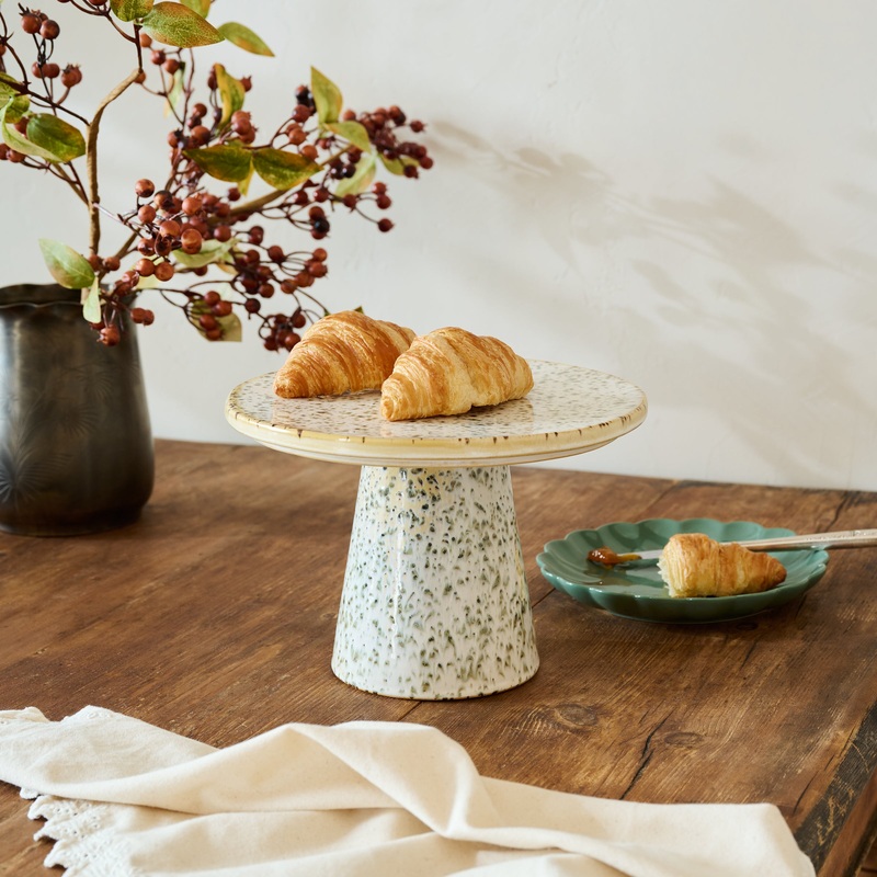 Elevate your dessert presentation with this vintage-inspired Forest Green Speckled Cake Stand. Crafted from durable ceramic, its charming speckled finish adds a rustic touch to any table setting. Perfect for showcasing cakes, pastries, or appetizers with s
