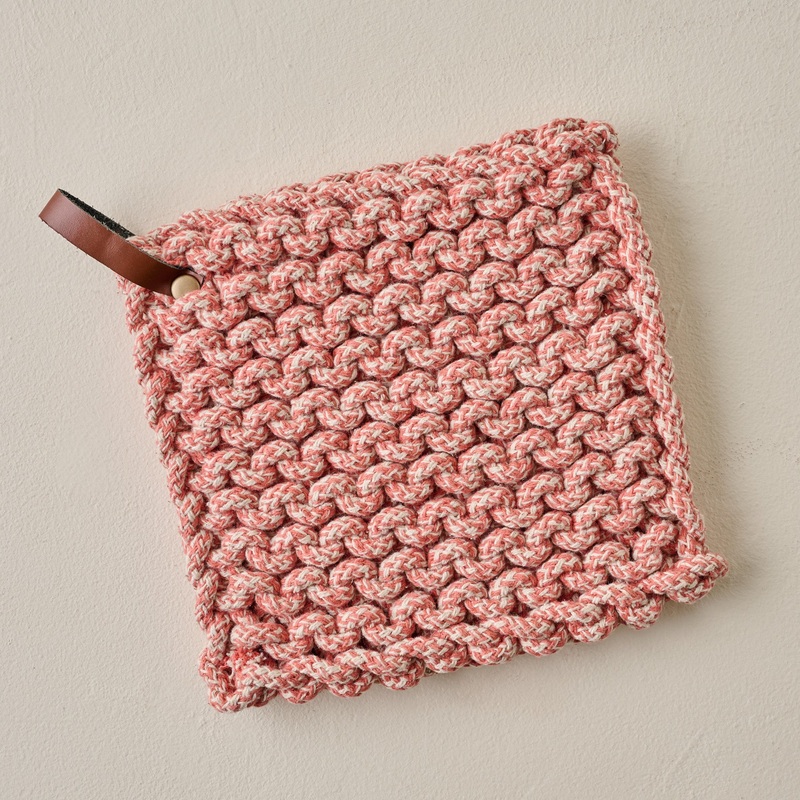 Hand crocheted with durable, heat-resistant yarns, this pot holder features heathered hues and a leather loop to hang when not in use.