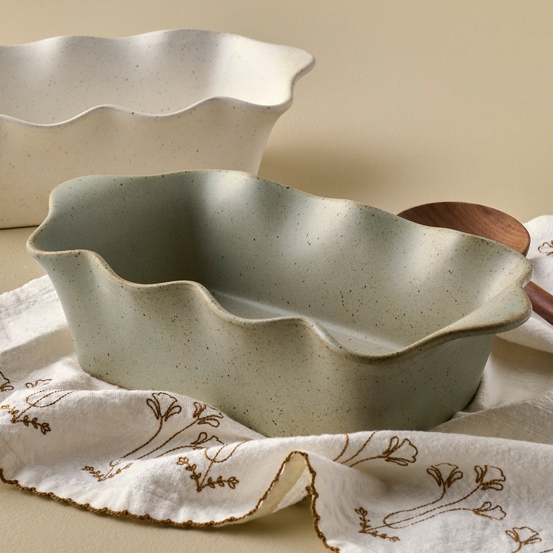 A beautiful way to bake breads, cakes, and more. Our Loden Green Scalloped Loaf Pan is crafted from durable ceramic with a gentle bend around the edges and a delightful speckled glaze. Exclusive to . Note: Due to the reactive nature of the glaze, slight va