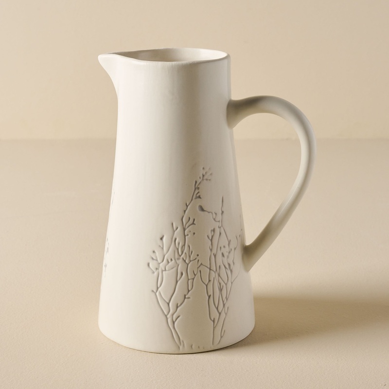 Add an element of botanical beauty to your table with the Pressed Flower Pitcher. This ceramic vessel features a simple silhouette and gives the impression of pressed florals cast into clay. Pair with our Pressed Flower Plaque Coasters for a coordinated lo