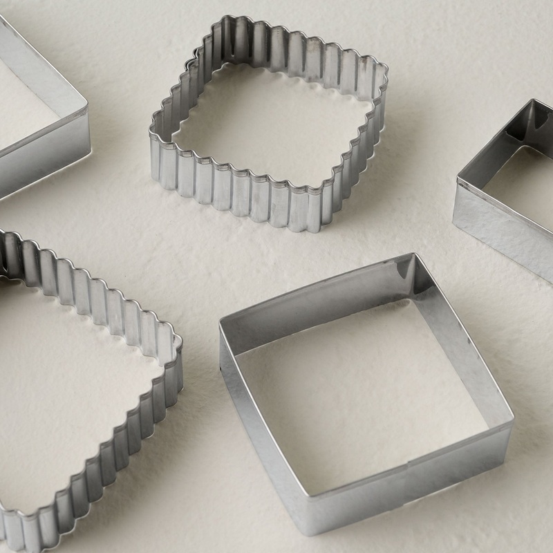 Coming in a nested set of five, this metal cookie cutter set includes both square and scallop-edged cutters to add a sweet flourish to your favorite cookie recipe. Plus, it includes a case for safekeeping in the kitchen. Pairs well with the Floral Embossed