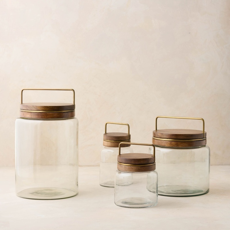 Designed in Waco and made exclusively for , the Antique Brass Canister was created to make it easier to visualize your pantry. Featuring a wood and metal lid with an antique brass finish, this glass canister brings character to any counter, shelf, or table